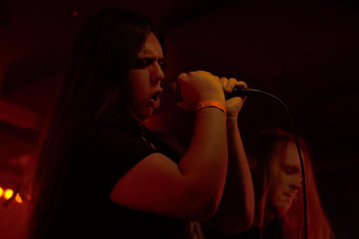 Akkompagneret af atmosfærisk susen og skratten fra højtalerne indtog kvartetten selvsikkert scenen i det lille lokale, der efterhånden var godt fyldt op med forventningsfulde metalentusiaster. Allerede inden sættet for alvor begyndte, fremstod de fire musikere som én enhed med et strømlinet visuelt udtryk, og selvom dette blot var anden optræden med bandets nye bassist, Lucas Nørup, lignede det, at han altid havde været med. Det skulle vise sig, om det auditive ville stå lige så snorlige. Et ubestridt højdepunkt var definitivt deres spritnye single, “Collide”, der har veleksekverede temposkift ført an af trommen spillet af Anton Hansen og guitarpassager, der balancerede perfekt mellem sagte klimpren og hårdtslående riffs leveret af Lasse Braun. Det vidnede om, at bandet virkelig er ved at finde deres helt egen stil. På grund af det meget voluminøse lydbillede blev udtrykket til tider desværre en smule mudret, og særligt vokalen var engang imellem lidt svær at høre gennem de massive trommepassager – det kom dog også en smule an på, hvor i rummet man befandt sig. Langt hen ad vejen kom Blodmåne dog rigtig godt fra land og leverede en optræden, der bugnede af fortræffeligt guitararbejde, medrivende melodier og intensitet. Sættet blev afsluttet af “Luctus”, der lagde op til aftenens allersidste pit.
