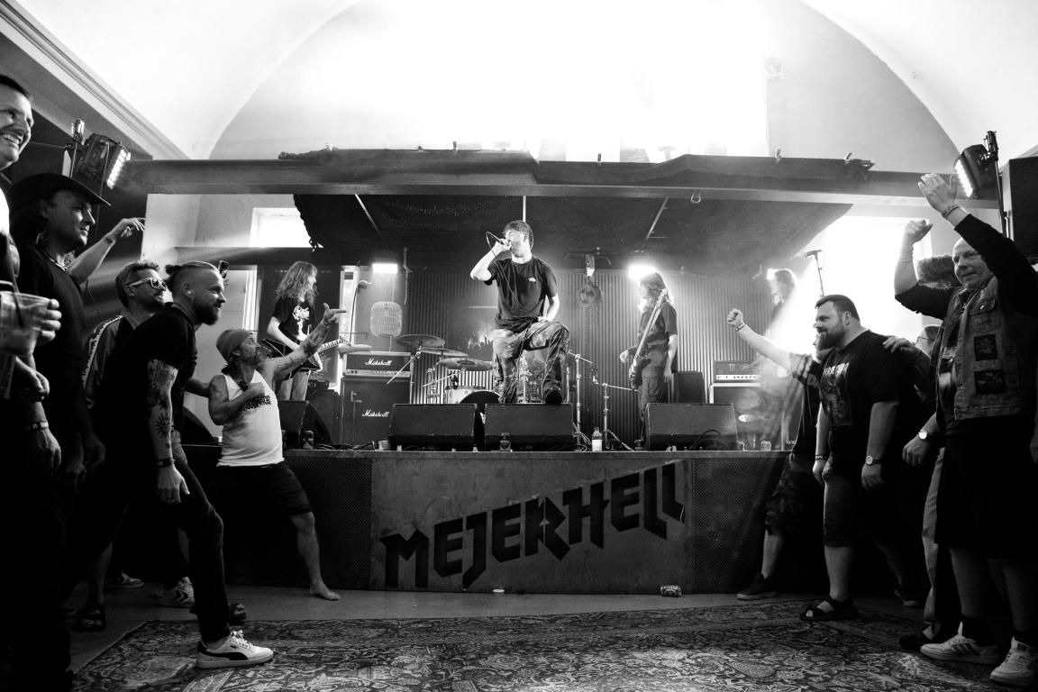 Forsanger Christoffer Kofoeds vokal overbeviste mig ikke til fulde denne dag. Om det helt kunne tilskrives lydbilledet, eller om han hist og her kom for tæt på mikrofonen, vil jeg ikke gøre mig til absolut dommer over, men han gik ikke altid rent igennem – heller ikke når han mellem numrene henvendte sig til publikum. Undertiden faldt han ud af sit growl og fremsatte en mere tvivlsom, ren vokal. Måske var det hensigten? Under alle omstændigheder gav det en lidt ujævn oplevelse, som publikum dog ikke klandrede ham for. Det var tydeligt, at Kofoed var glad for at varedeklarere musikken som ‘fe’ dø’’. Bevares, det er vel ikke uden grund, at bandet er populært, men det krævede næppe fem gentagelser at få publikum overbevist. Jeg er stor fan af parolen ‘show it, don’t tell it’. Det gjorde ungersvendene da for så vidt også, men så lad værket stå alene på den konto. Metalguderne skal vide, at Neckbreakker har optrådt i en sådan grad, at debutpladen lod vente på sig, og den praksis har da også givet afkast på publikumstæften. Alligevel kan jeg heller ikke lade være med at tænke, at interaktionen med publikum var lige lovlig meget forankret i kommandoer som ‘op med hænderne’, ‘vink med armene’, og ‘skub til dem foran’. Nuvel, jeg leder måske efter hullerne i smøreosten, men vi har på dette års Mejerhell set skoleeksempler på ‘kongens efterfølger’, når bands mere organisk fik publikum med på noderne. “Silo” skulle blive sidste nummer fra Neckbreakkers hånd, og publikum kvitterede med jubelråb og klapsalver. Dødsværket var fuldbragt, og kvintetten kunne velfortjent forlade scenen og tage del i festlighederne, inden turen gik videre til næste job. Ja, de har fart på.