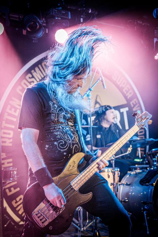 De lokale skarpskytter i Patron var blevet valgt til at skyde aftenen godt i gang. Patron består af tidligere medlemmer fra Anoxia og Viva la Wolfe og spiller oldschool stoner/doom. Noget, jeg lagde mærke til, da bandet fremførte første nummer, var, hvor meget bassen fyldte i lydbilledet. I løbet af de tredive minutter, esbjergenserne spillede, gik det så op for mig, at det ikke var et resultat af en halvhjertet lydprøve, men tværtimod en integreret del af Patrons lyd. Dette understregedes da også i sidste nummer med noget så sjældent nu til dags som en bassolo med effektpedal. Forsanger Gessner Roland brændte virkelig igennem og fremstod uimodståeligt talentfuld. Han lød det ene øjeblik som Layne Staley (Alice in Chains) og det næste som Kory Clarke (Warrior Soul). Publikum vuggede lidt med til de langsomme og slæbende rytmer, og jeg så mere end et par anerkendende nik rundtomkring i salen.