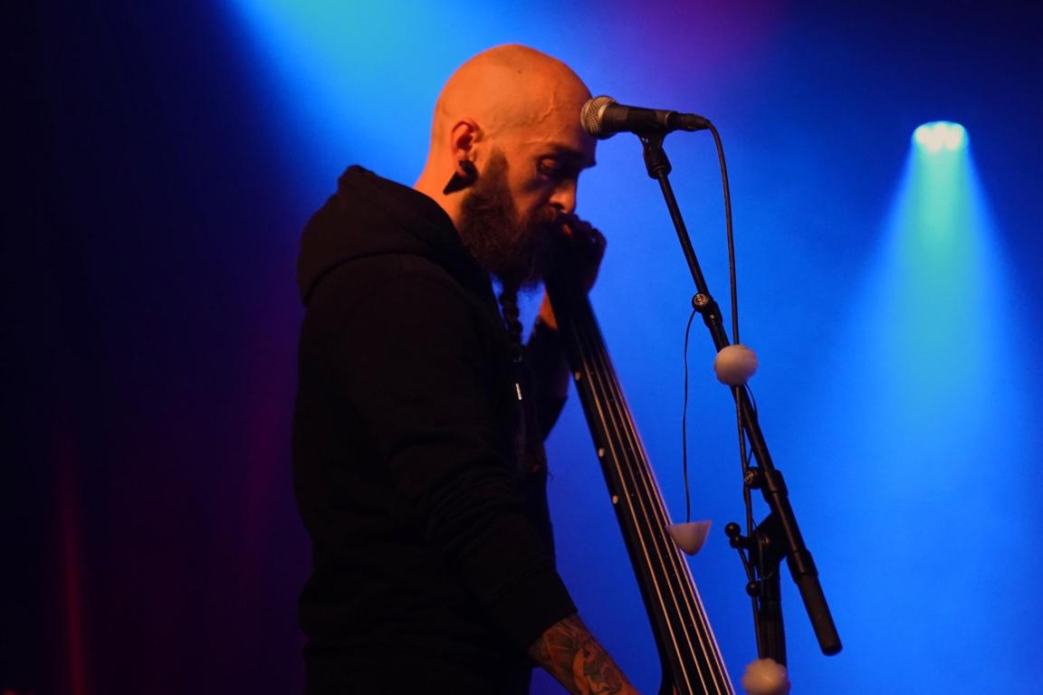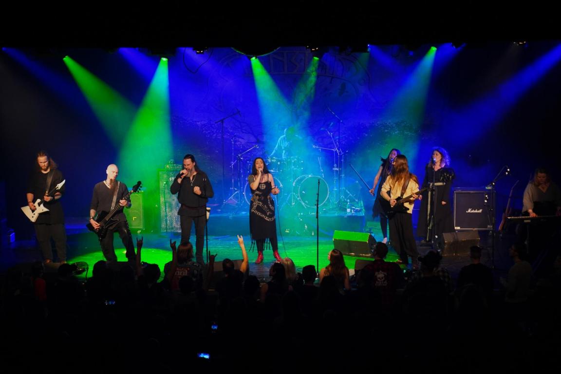 Akkompagneret af et energisk Vansind-heppekor indtog de syv bandmedlemmer, der under størstedelen af deres sæt blev suppleret af Laura Emilie Beck på violin og kor og Tanja Dræberg på kor, scenen. Det var således allerede fra første øjeblik helt tydeligt, at bandet havde publikum på deres side. Hobbyvikingerne lagde ud med “Grib til Våben” efterfulgt af “Blodmosen” fra deres anmelderroste debutplade, Mørket, hvor lyden beklageligvis var en kende mudret – hvilket nok kan være lidt svært at undgå med hele ni musikere på scenen. Heldigvis fungerede det langt hen ad vejen helt fortræffeligt, og især under tredje nummer, “Blót”, udlevede de deres fulde potentiale. Særligt Line Burglins vokal stod skarpt i de mere nedtonede passager, hvor også fløjten, spillet af Rikke Klint Johansen, var sandt øreguf. For de øvrige fremmødte så det dog ud til, at særlig efterfølgende nummer, “Den Farefulde Færd”, faldt i god jord, for ikke nok med at mange sang med af deres lungers fulde kraft, så var der også flere, der satte sig i formation på salens gulv og roede afsted, som var de på vej til at overfalde Lindisfarne. Også sanger J. Asgaard var kampklar og leverede growls, der aldrig har lydt ondere og mere gennemtrængende. Mellem sangene fremstod Asgaard ligeledes selvsikker og holdt god kontakt til publikum, hvor han også præsenterede Charlie Selvig Jensen, “verdens bedste standin”, der var guitarvikar for Kirk Backarach denne aften i Aalborg. Et nummer, jeg også lige bliver nødt til at nævne, er “Frigg”, hvor Burglin endnu en gang leverede en billedskøn vokal, og Vansind for alvor viste deres samspilsevner. Bandet fortsatte den gode stil med afslutningsnummeret “Håbet er Sort”, der blev leveret til UG. Her blev den stuvende fulde scene, der med ni musikere og deres instrumenter nærmest allerede var fyldt til bristepunktet, lige et hak mere fyldt, da gæstemusikanterne Rune Sawath Jensen og Tobias Eriksen kom ind og velsignede publikums ører med skøn sækkepibe. Én sækkepibe er godt – tre sækkepiber er helt vidunderligt! På trods af enkelte udfordringer på lyden levede Vansind op til forventningerne og cementerede endnu en gang deres position som hele Danmarks folkmetal-darlings.