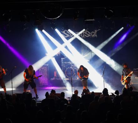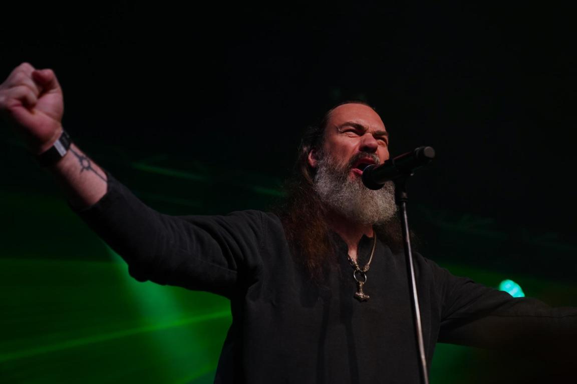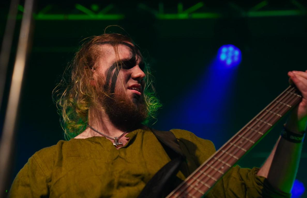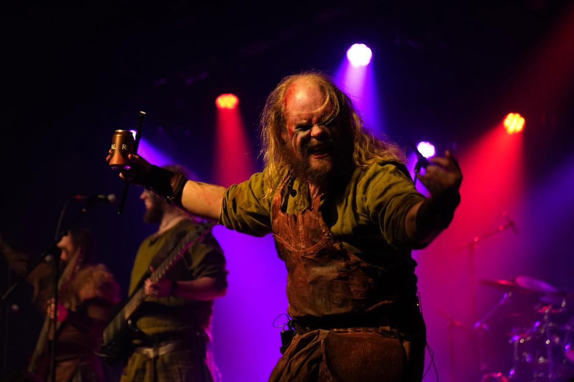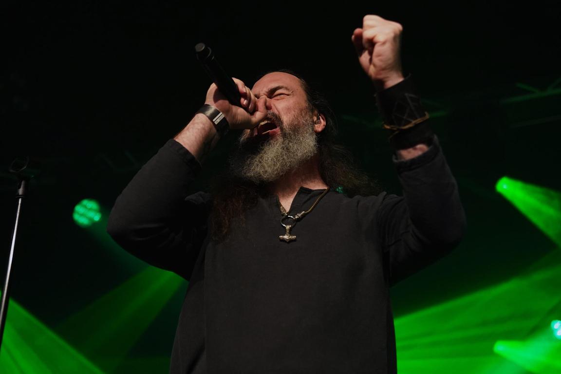 Aftenens andet band var svenske Grimner, der sidst gæstede en dansk scene i 2023, men nu altså var klar igen – mindst lige så klare som publikum, der talstærkt havde placeret sig foran scenekanten for at opleve bandets medrivende sceneoptræden på nært hold. Gennemgående var energien nemlig i top, og især fløjtespiller Johan Rydberg gjorde sit for at holde publikum i gang, for hvis han ikke lige fyrede nogle seje fløjterier af, trampede han energisk rundt på scenen og opfordrede til heyråb, som de fremmødte med glæde deltog i. Det skete blandt andet under tredje nummer, “Ur Vågorna”, fra Urfader, udgivet i 2022, hvor også vokalfronten ført an af Ted Sjulmark, men godt suppleret af bassist Axel Elowson, keyboardspiller Kristoffer Kullberg og Rydberg fyldte Skråen med rå energi. Inden sættet fortsatte med sjette nummer, “Elftevisan”, adresserede Sjulmark det, som den opmærksomme tilskuer allerede havde bemærket: Grimner var ikke fuldtallig – andenguitarist og cleanvokalist Marcus Asplund Brattberg manglede. Bandet gjorde dog sit bedste, så det næsten ikke kunne mærkes, og var nu klar til “a fast one”, hvor publikum for alvor fik sat gang i pitten. Dette sæt, hvor det ene højdepunkt fulgte det andet i hælene, blev afsluttet med “Eldhjärta” fra Frost Mot Eld udgivet i 2016, der i hvert fald for undertegnede satte kronen på værket. Ikke kun fordi nummeret var det første Grimner-nummer, jeg i sin tid hørte, men også på grund af sangens energimættede melodi og et mageløst vokalspor. Denne anmelder var således godt tilfreds og håber, at disse skønne svenskere snart kommer tilbage til Danmark igen.
