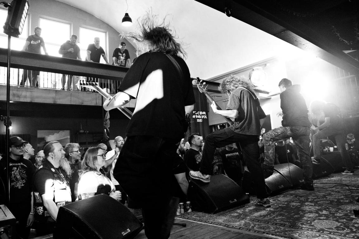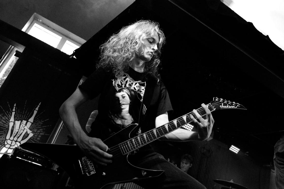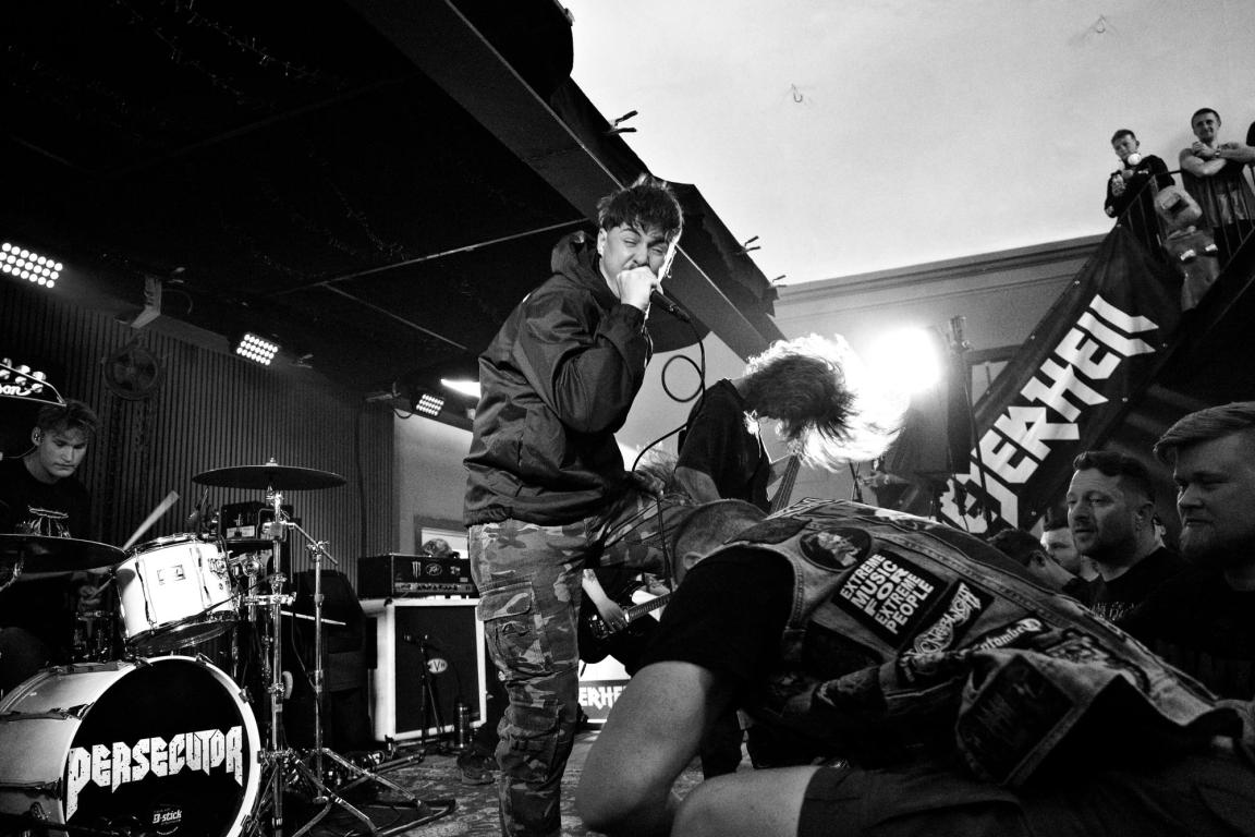 Med “Shackled To A Corpse” befandt mejeriet sig atter i landet, hvor den brutale dødsmetal regerer, og det var tydeligvis, hvad gæsterne var sultne efter. Lynhurtigt blev der sat gang i en circlepit, og det skulle også vise sig, at der ikke var mange øjeblikke med tomgang på gulvet. De to spadeførere fra Persecutor, Benjamin Stage og Stefan Sørensen, havde åbenbart ikke fået nok af pitten efter deres egen fest tidligere og var fast inventar under størstedelen af koncerten. Jeg er sædvanligvis til fals for rytmesektionen, og jeg brugte da også en væsentlig del af forestillingen på at betragte Neckbreakkers nye mand på trommerne, Viktor Bjørnstad, der også slår sine folder i hardcorebandet Split. Det var en fornøjelse at se ham udfylde de store sko, som Anton Bregendorf efterlod tidligere i år. Det er mit første bekendtskab med Bjørnstad, men mit førstehåndsindtryk var, at han besad lige dele kraft og præcision – nøjagtig, som jeg kan lide mine tøndebaskere. Da sættet nærmede sig sin afslutning, og der blev spurtet gennem “Face-Splitting Madness”, var manden bag kedlerne da også langt mere våd end tør. Sikke en kraftudladning!