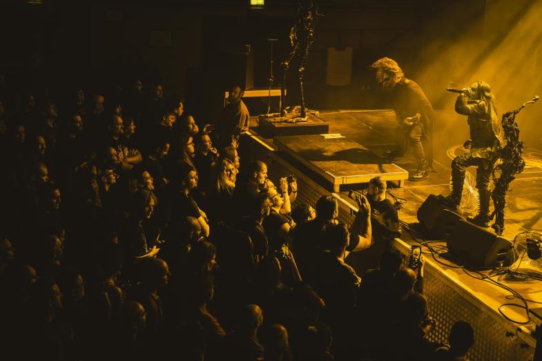 Der var lagt op til en god gammeldaws sort-hvid gyser på Amager Bios scene. Scenefolk og roadies havde løbet hurtigt for at få placeret to meget livagtige skeletfigurer, der tårnede op over publikum. Trommer og klaver var hegnet inde bag kirkegårdens gitter og slyngplanter, og dæmoniske figurer spøgte i backdroppet. Æstetisk lå det et sted mellem de gamle Dracula-film og Stranger Things. Et velovervejet setup, der fint spejlede Cradle of Filths tilgang med at blande 90’er-goth med moderne ekstremmetal. Efter en forlænget intro over PA’et med klaver og kirkegårdsstemning kom bandets patriark, Dani Filth, stavrende ind på scenen med sin genkendelige mimik, gotiske pigge og læderoutfit. Hr. Filth har altid haft en særlig stil på scenen, og denne anmelder ynder at sammenligne ham med en koffeinboostet goblin.